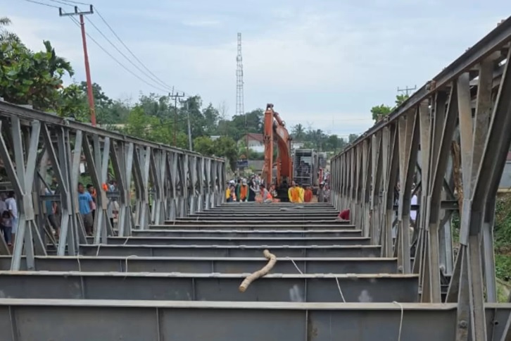 Saat ini, jembatan darurat telah tersambung, namun masih belum bisa dilalui oleh kendaraan. (Redaksi)